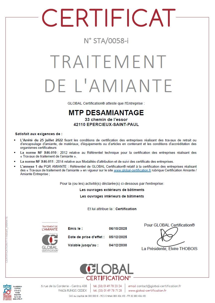 Certification - Traitement de l'amiante